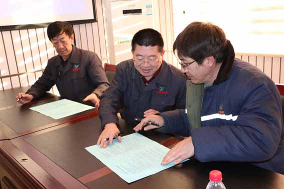 公司總經(jīng)理佟國山、公司副總經(jīng)理兼工會主席邱延軍與生產(chǎn)單位簽訂2016年安全生產(chǎn)目標責(zé)任狀